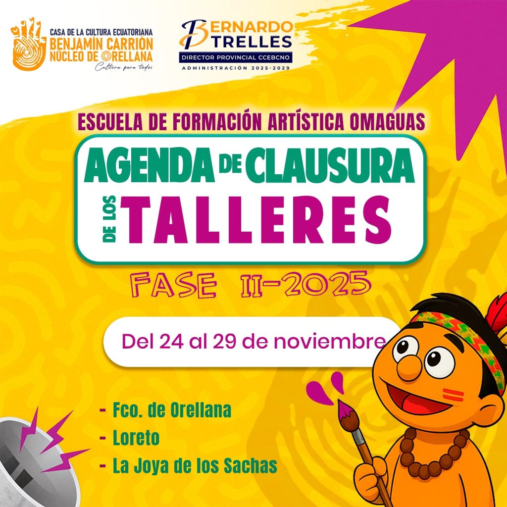 La Casa de la Cultura Ecuatoriana “Benjamín Carrión”, Núcleo de Orellana, invita a toda la ciudadanía a participar en la clausura de los talleres de canto, piano, guitarra, ballet, danza folclórica, artes plásticas, batería y bajo eléctrico, que se desarrollará del 24 al 29 de noviembre.