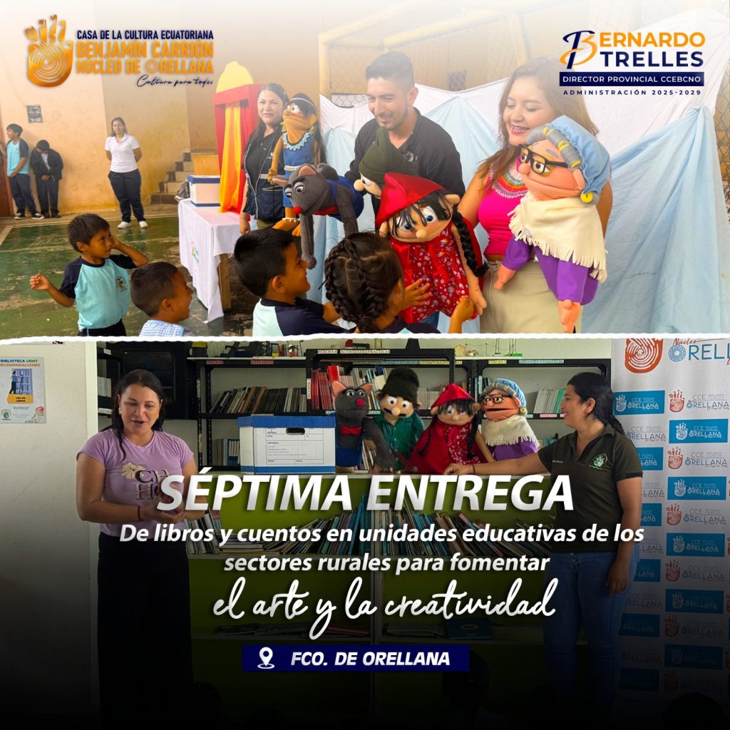 La Casa de la Cultura Ecuatoriana Benjamín Carrión, Núcleo de Orellana, continúa acercando la lectura a las zonas rurales de la provincia a través de su programa de promoción cultural. Los días 29 y 31 de octubre se llevó a cabo la séptima entrega de libros y cuentos en las Unidades Educativas Yasuní y Cabo Wilson Cueva, ubicadas en las comunidades de Dayuma y Jaguar 2.